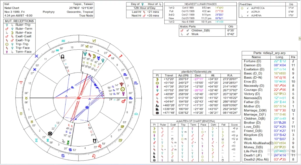 古典占星的系統之一,透過一個人準確的出生時間地點,可以看得出你星盤帶來的狀況是什麼,包含了原生家庭、感情關係、財富…等等