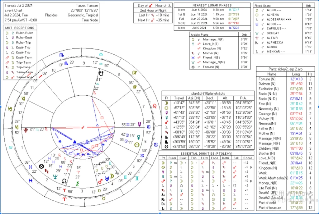 因為是要問壓賽事會不會賺錢,所以參考:一宮主星(代表我自己)、二宮主星(代表我的錢)、月亮(我的分身)、八宮主(莊家的錢)。在這個問題中,先關注:一宮主星是:土星雙魚逆行,代表有發財夢的我,正在ㄎㄧㄤ,腦袋不清楚,也可能誤判,事實證明我也誤判,二宮主星木星雙子座,八宮主星水星正位於巨蟹座的29度55分即將換星座。代表我的分身,月亮27度44分。