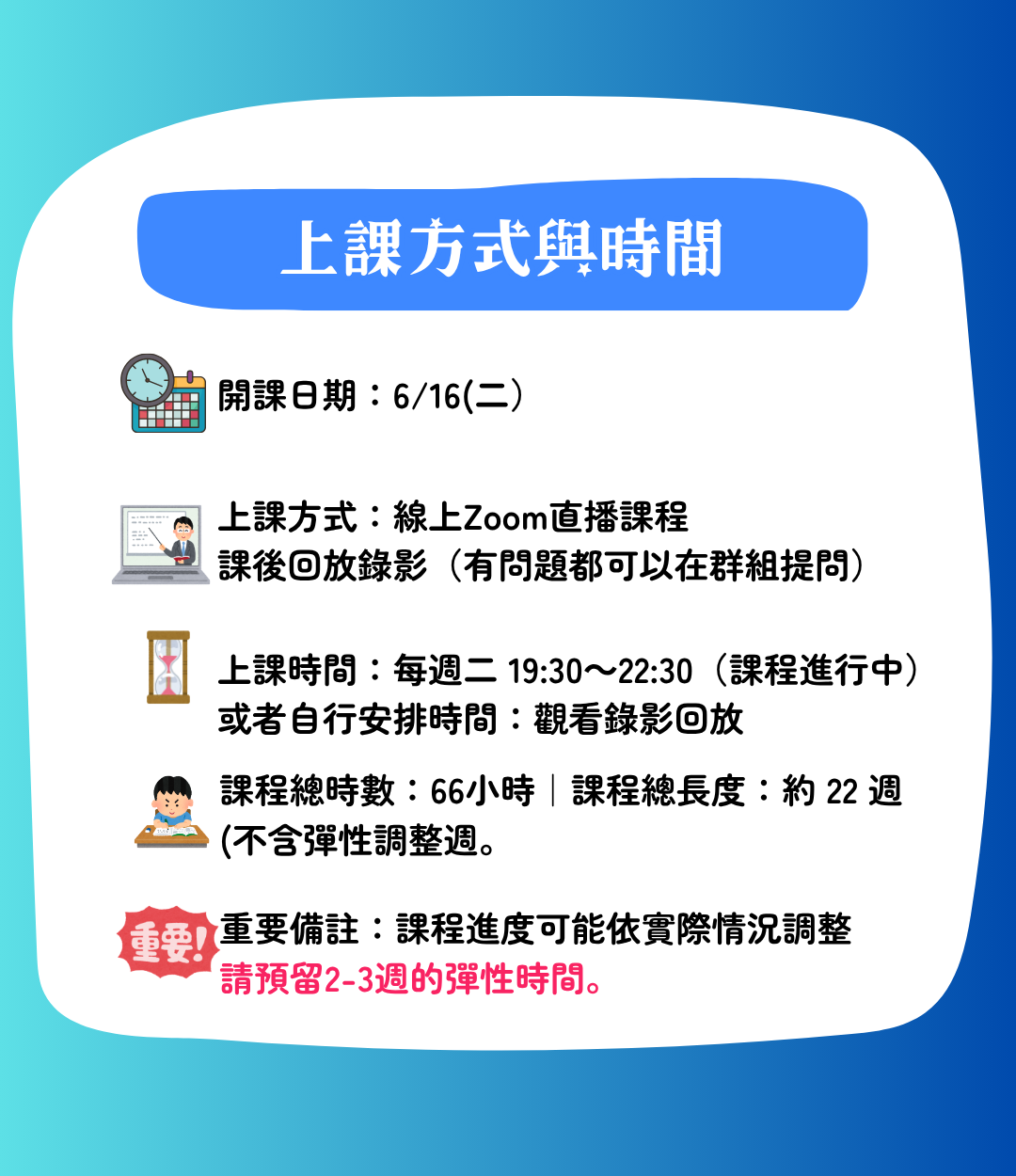 三階段共 66小時,約22週。每週二晚上 19:30–22:30,遇國定假日順延。