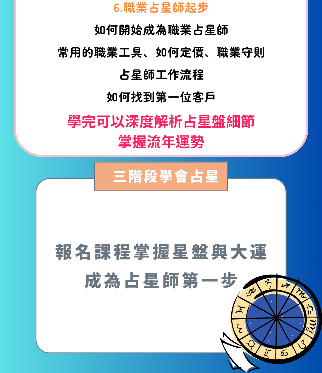 - 單元六:職業占星師倫理與實務 — 收費模式、諮詢流程、找到第一位客戶、占星師工具箱