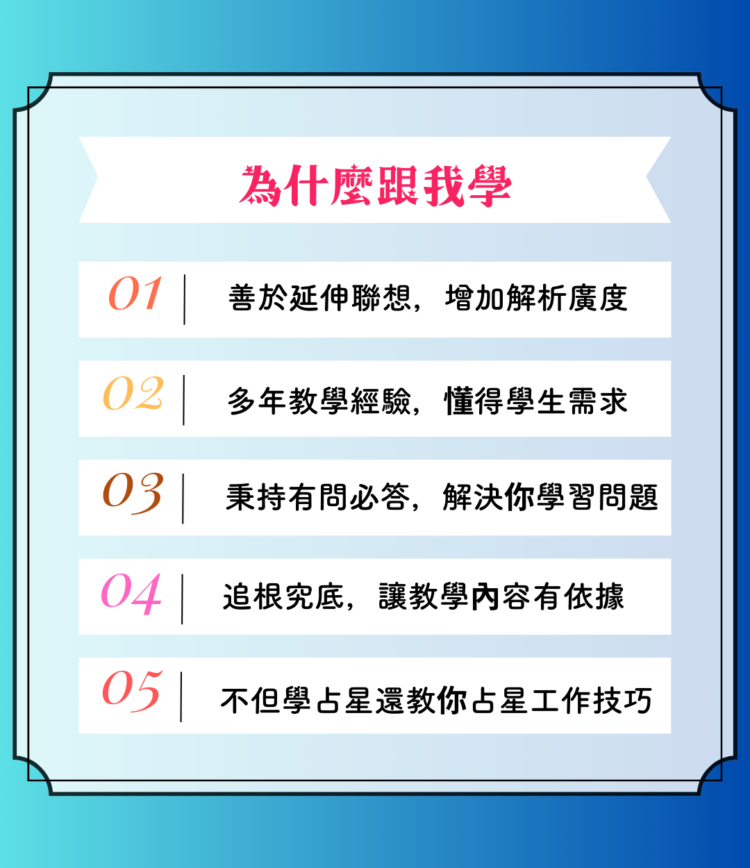 教學風格理性、邏輯清晰,擅長將複雜學理拆解成可複製的判斷步驟,秉持「有問必答」原則。我希望帶給你的,不是模稜兩可的命理預測,而是能經得起推敲的占星智慧。