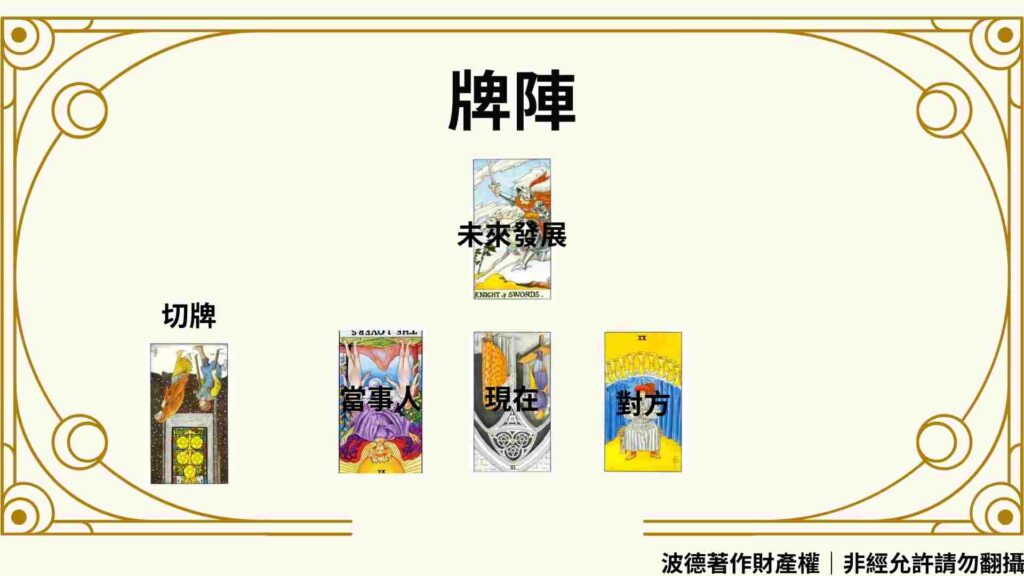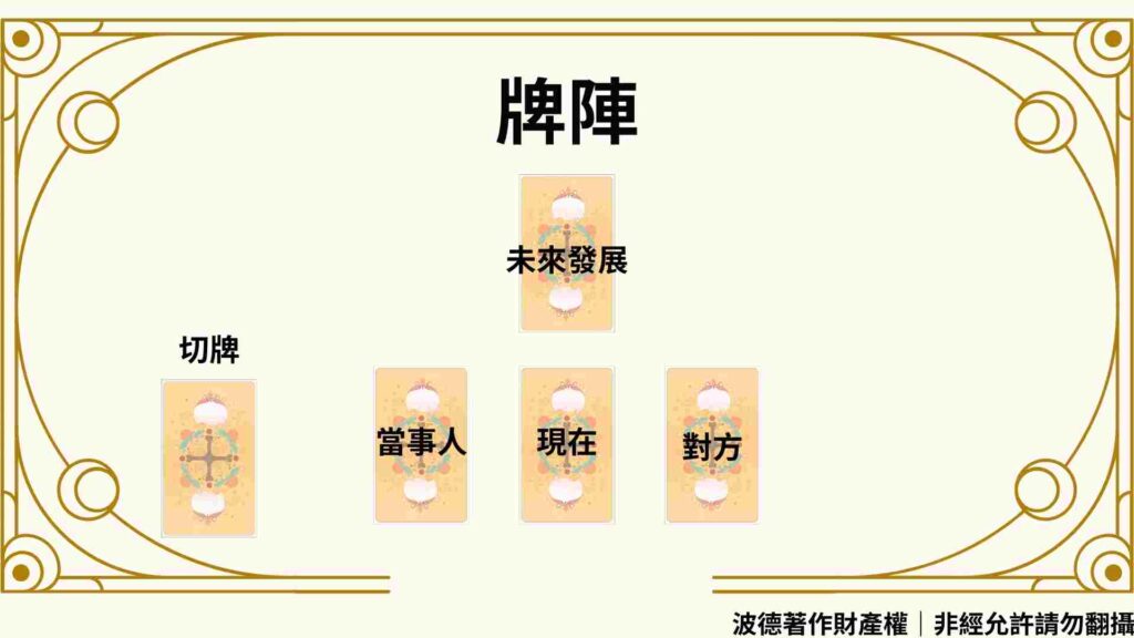 為了解這個問題,我會使用關係牌陣。這個牌陣之前有介紹過,今天我會簡單再講解一次。切牌的部分代表的是當事人為什麼會問這個問題,而其他位置的牌則像是一個合盤的概念,可以幫助我們解讀雙方的相處模式。
