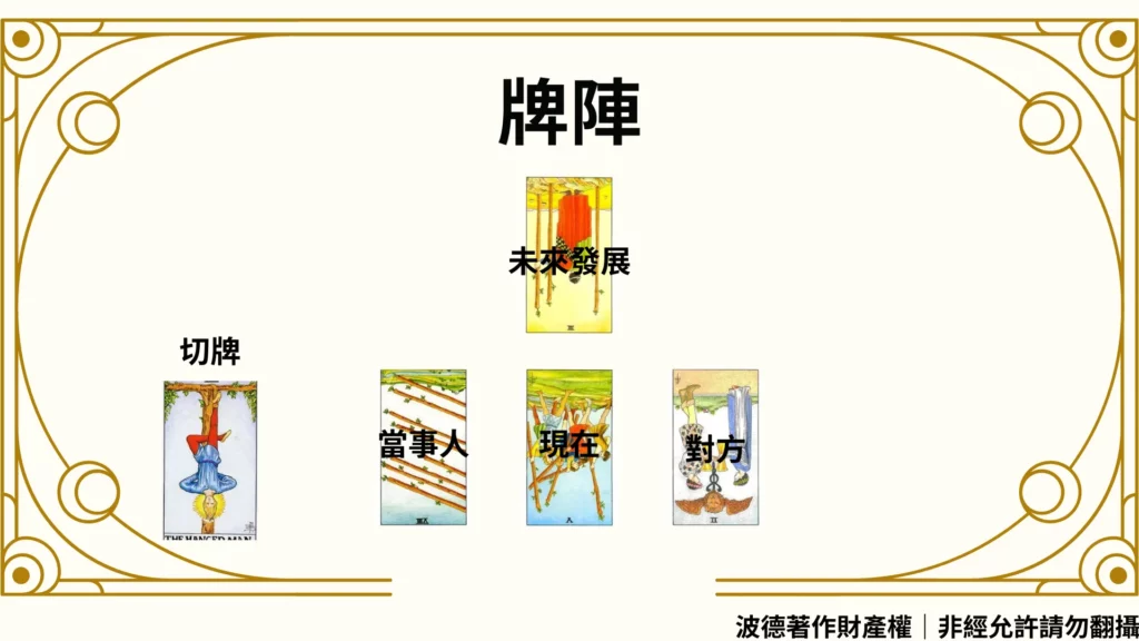 波德註解:但凡只要有人想要算跟特定的人,感情發展,我都會用關係牌陣,這個牌陣用得好的話,你可以知道對方在想什麼?為什麼不跟你互動,或者他認為現在的關係是如何,以及該怎麼讓這段關係有所進展,都可以從這四張牌的組合互動當中找出原因,是一個蠻好用的牌陣。如果你是對於塔羅牌有興趣的話,要記得,牌卡並不是數量用得多,就會準,而是準確地找出牌與牌之間的關係,才可以完整解析這個牌陣。以下提供範例作為參考。