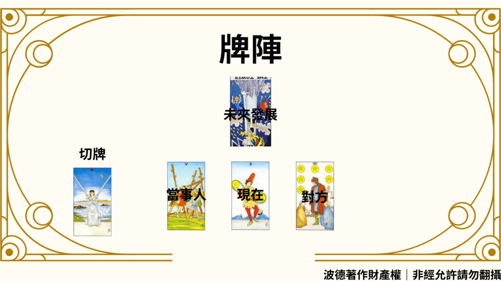波德註解:但凡只要有人想要算跟特定的人,感情發展,我都會用關係牌陣,這個牌陣用得好的話,你可以知道對方在想什麼?為什麼不跟你互動,或者他認為現在的關係是如何,以及該怎麼讓這段關係有所進展,都可以從這四張牌的組合互動當中找出原因,是一個蠻好用的牌陣。如果你是對於塔羅牌有興趣的話,要記得,牌卡並不是數量用得多,就會準,而是準確地找出牌與牌之間的關係,才可以完整解析這個牌陣。以下提供範例作為參考。