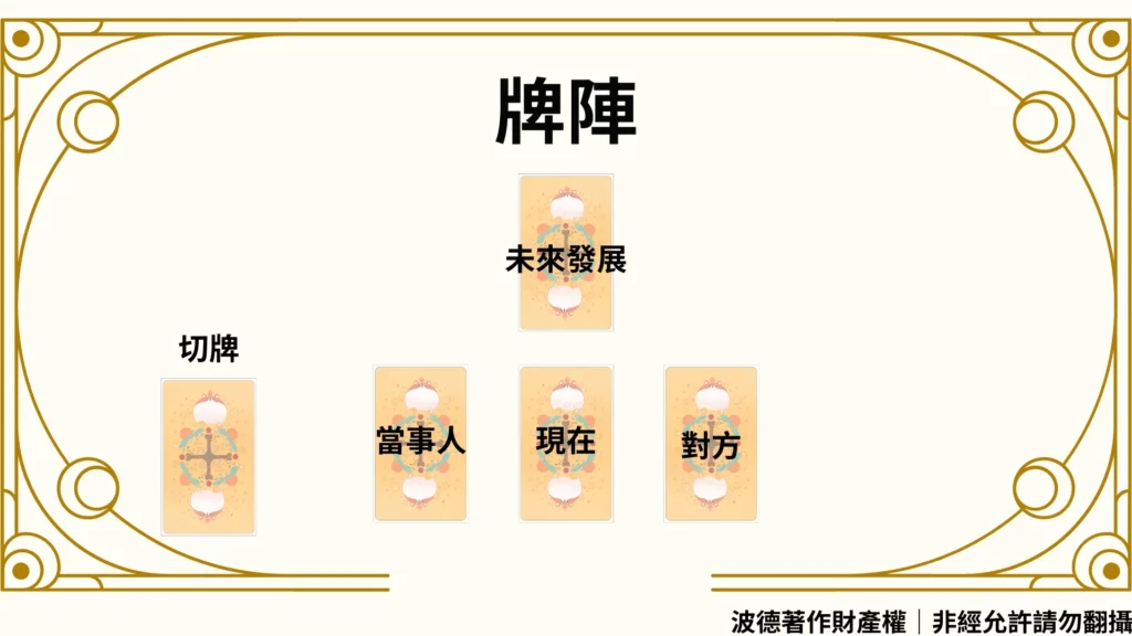 使用時機:當你想知道跟另一個對象的關係發展的時候,無論是合作對象、感情對象、家人、朋友、曖昧對象,只要是跟特定的人物有關,就可以使用關係牌陣。