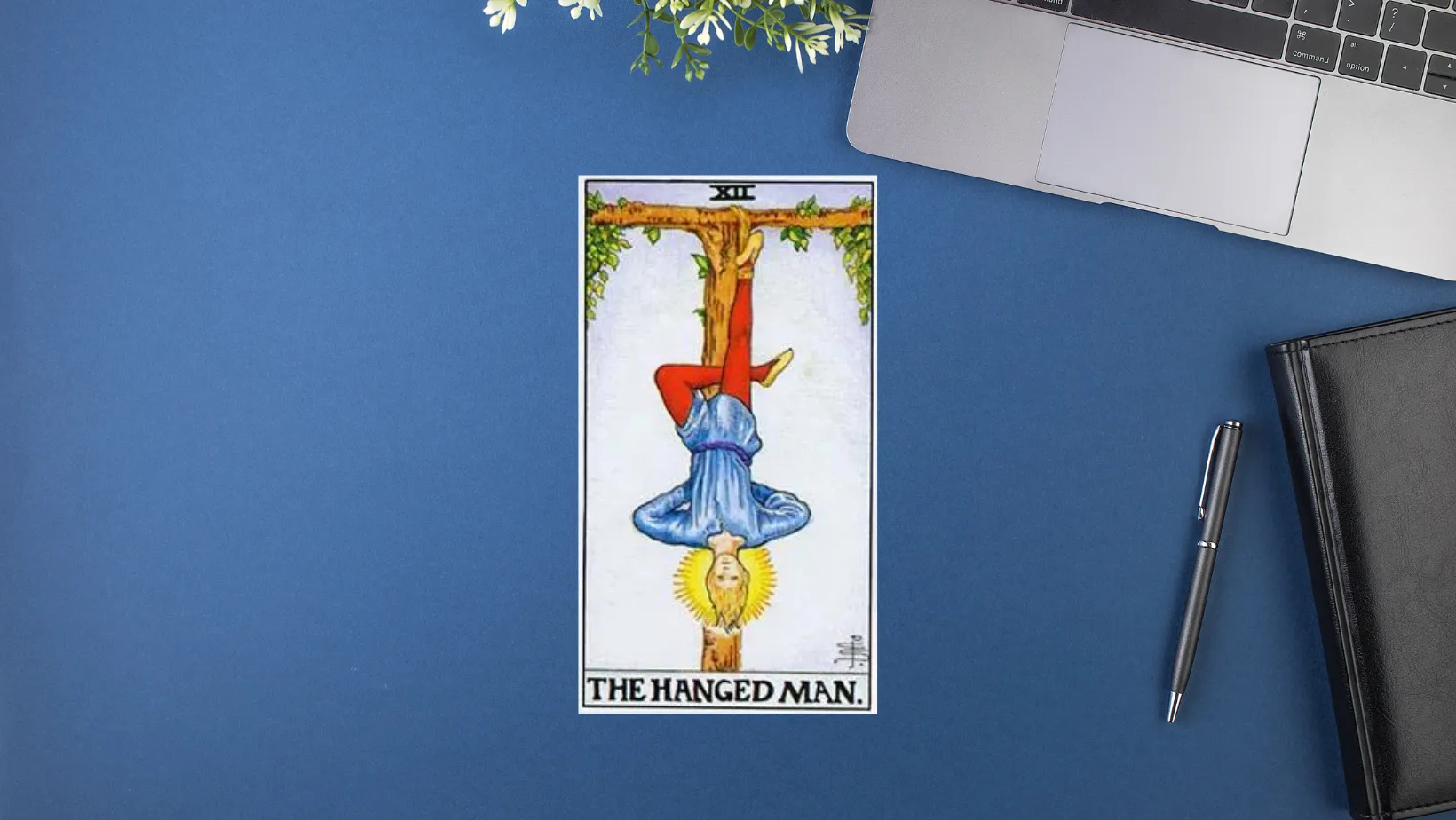 一個人吊在樹上, 身上穿著藍色衣服藍色暗示著感情, 紅色的褲子象徵著熱情, 怡然自得的樣子暗示著此時此刻的他是自願成為現在的自己, 倒掉的形象類似耶穌基督為世人釘在十字架的樣子, 頭頂發著光代表著犧牲帶來救贖的含義。
