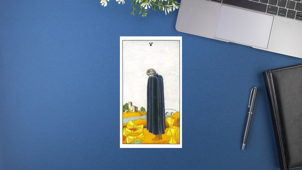 聖杯五這是一張象徵失戀的牌,感情占卜中如果搭配其他嚴重負面牌卡時,可以代表失戀的狀況,但大多數時候,因為這張牌是小牌,象徵的是像是失戀的感覺,但未必是真的失戀的情況,此時的你,覺得原本關愛你的人,不在理你,原本良好的關係,變成疏遠,也可能在感情中,你不在能用感情為出發點,得到對方的好處或關心,就像是談戀愛中,常常會認為對方變了,就像是聖杯五描述的狀況,但其實背後的兩個杯子,也暗示著情感仍然存在,只是在你沒注意到的地方而已。