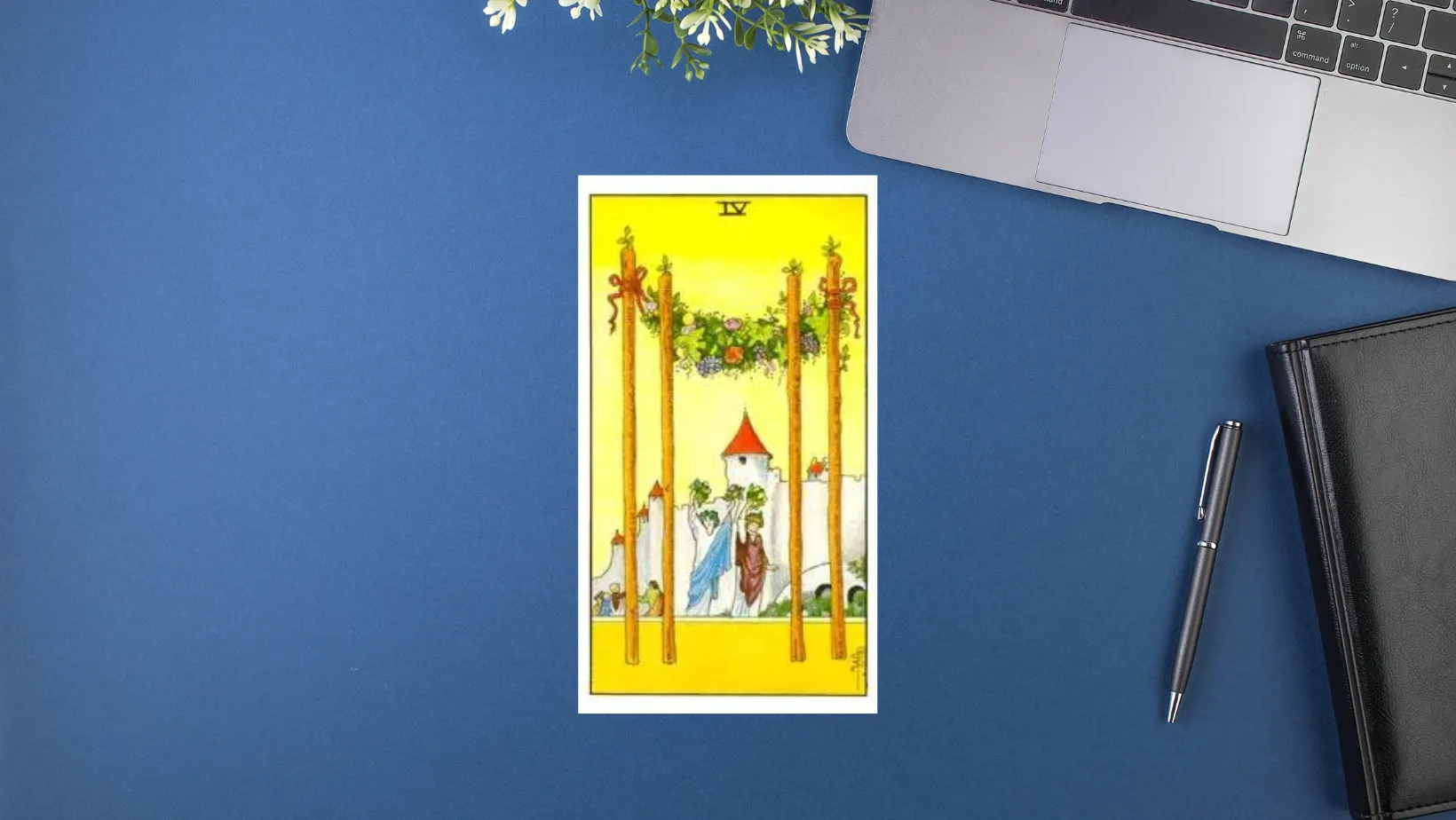 權杖四代表的是一個人自己行動後得到成功的狀態,可能是一次爭取案子成功的感覺,也可能是在工作上跟老闆爭取加薪成功的樣子,感情上也是跟心儀對象告白的成功,或者一次主動的表現得到對象的讚賞,抽到權杖四這張牌,心中想要完成的目標都有了自己踏實想要的結果,這張牌畫風就像是慶功宴一樣,之前努力的,都在這張牌時看到了努力的結果,是一張正面的好牌,由於是權杖牌組,也強調了,這張牌的成功是靠自己的掌握,跟自己的行動,如果偷懶不行動,是得不到這美好的果實的