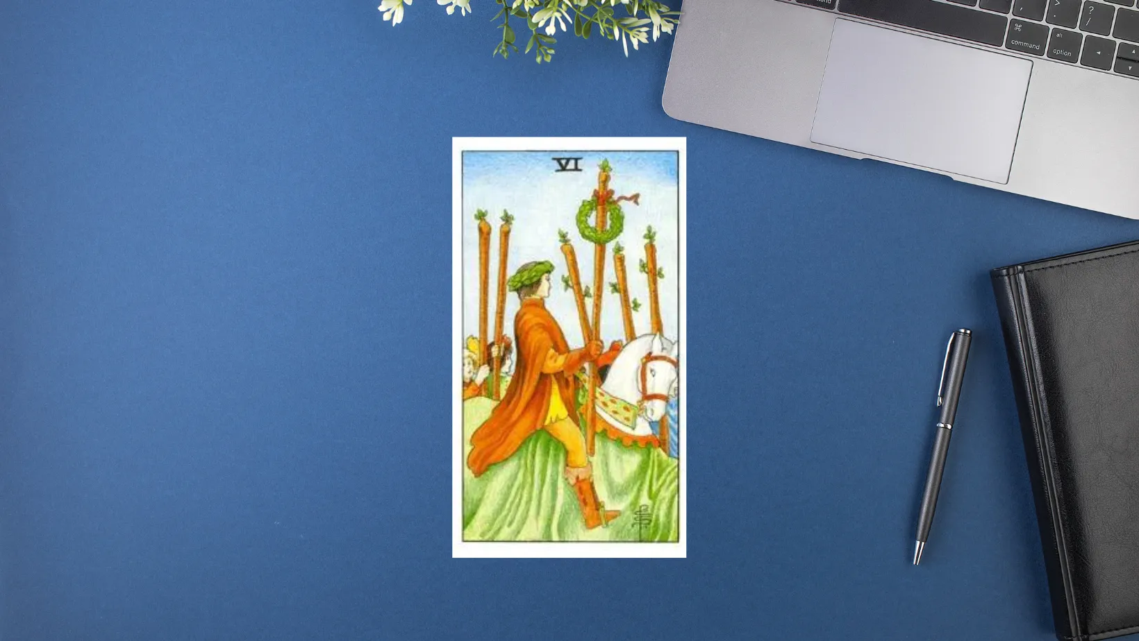 權杖六這一張形容勝利的場景,他是延續權杖五之後的場景,眾人從一場混戰之中找到突破口前進,權杖六也像是有一個人可以帶領這群旗鼓相當的人突破,他也像是以前三三國演義中三國歸一統的感覺,權杖六也強調這個勝利得來不易,難度比權杖四還高,勝利需要靠點時機跟機運才得到這個結果,同時也需要有好的領導給予的指引,就像是每場勝利的戰爭,都是需要透過一些好運氣才可以順利突破的,在占卜中象徵你好運的接到大案子,或者買到價格低的好房子,或者此時的你爭取的升遷機會可以順利的通過。