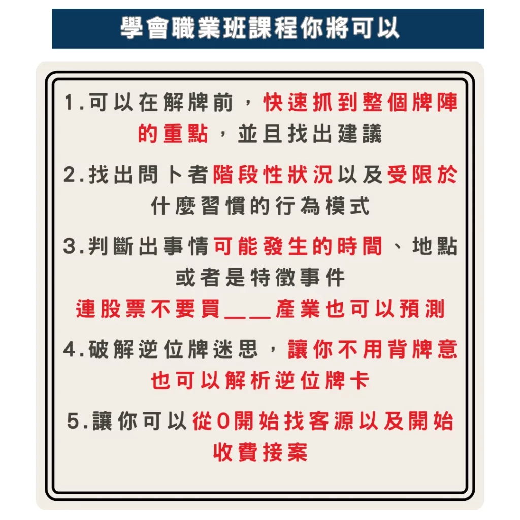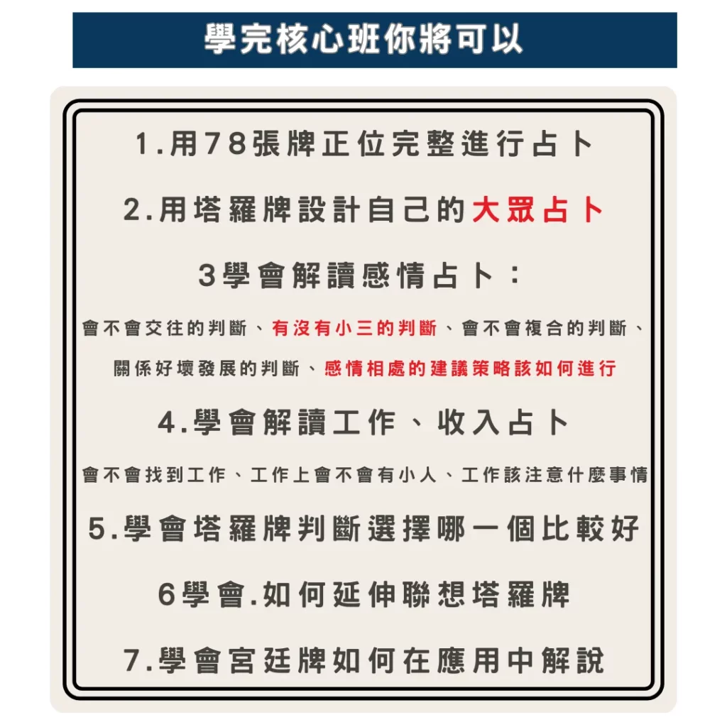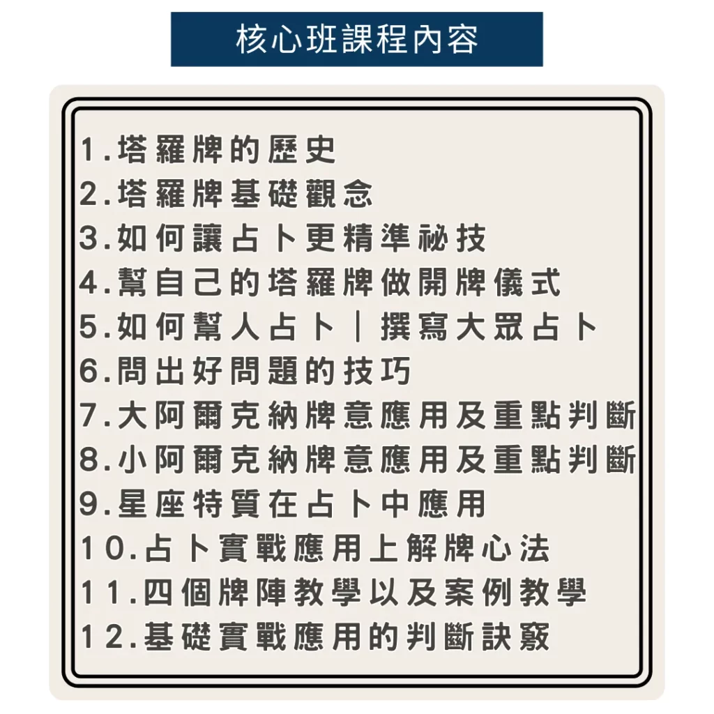 提供核心及進階課程內容,給想要學好塔羅基礎,以及想成為職業占卜師的學員最完整的課程內容