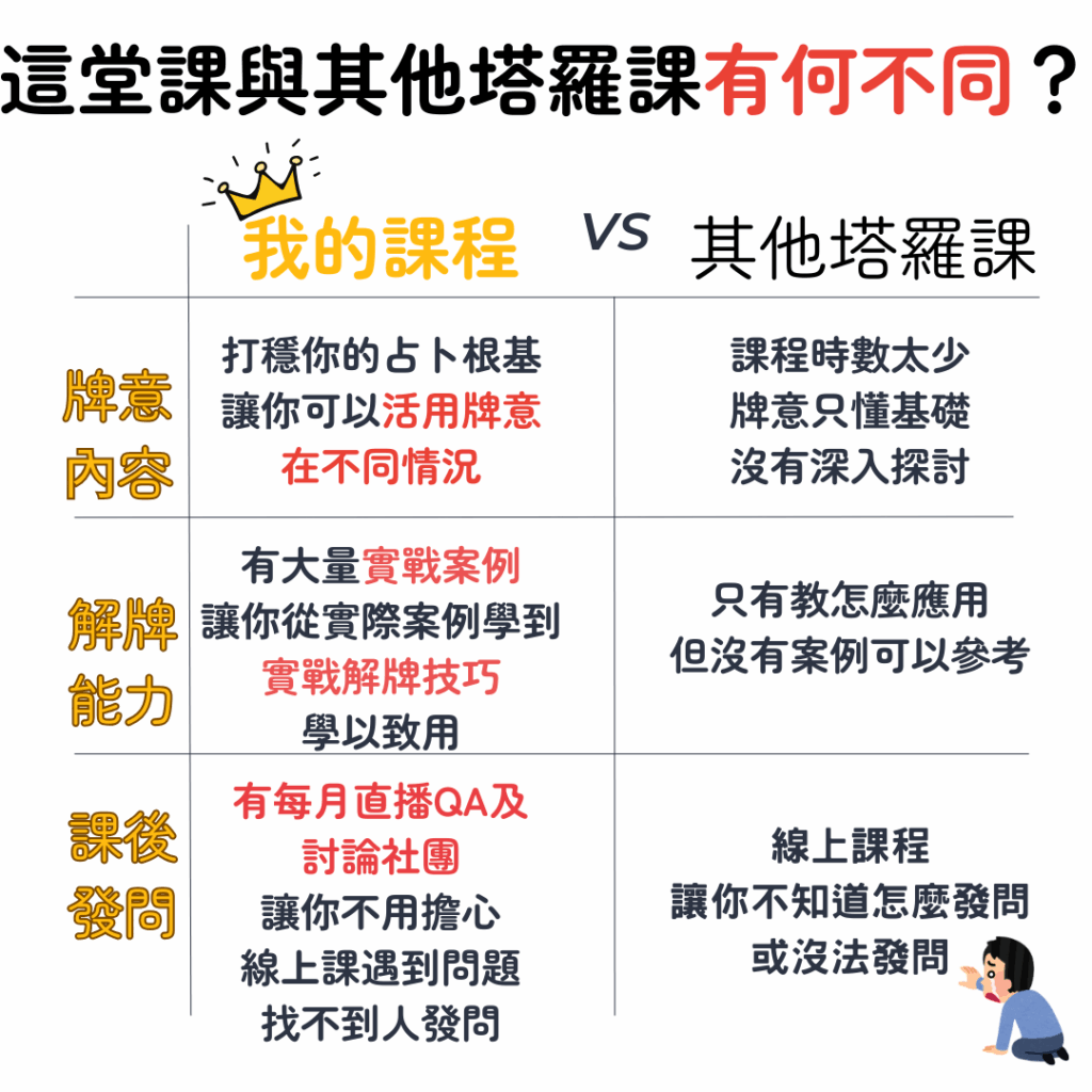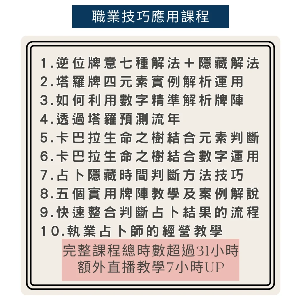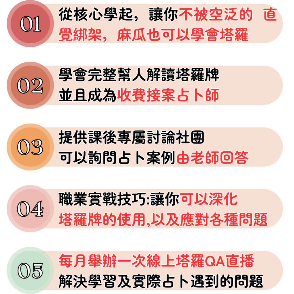 提供核心及進階課程內容,給想要學好塔羅基礎,以及想成為職業占卜師的學員最完整的課程內容